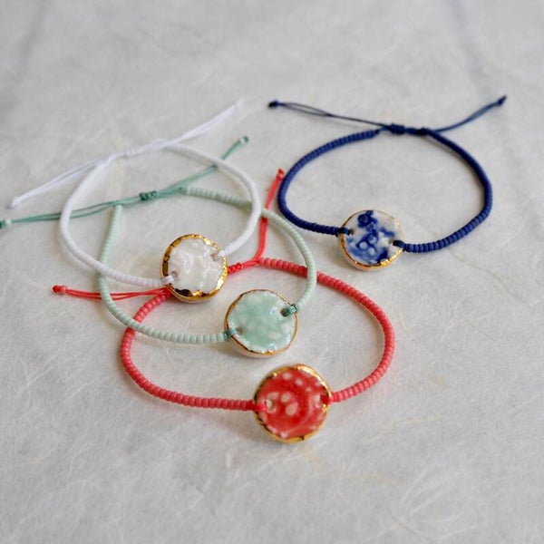 Armband met porseleinen rondje in wit.De armband is gemaakt van witte glaskraaltjes en sluit met een schuifknoop.Miyukikraaltjes voor de kenners.Doorsnede rondje 14mm