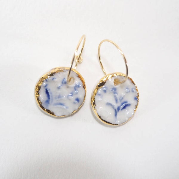 Aan goldfilled oorringen/creolen (15mm doorsnede) hangen porseleinen rondjes met een randje van 24-karaats goud. Nu ook mogelijk aan haakjes. Goldfilled haakjes met vlindertje. White decor is hetzelfde als gold drop Ringen en porselein, beide 15mm doorsnede