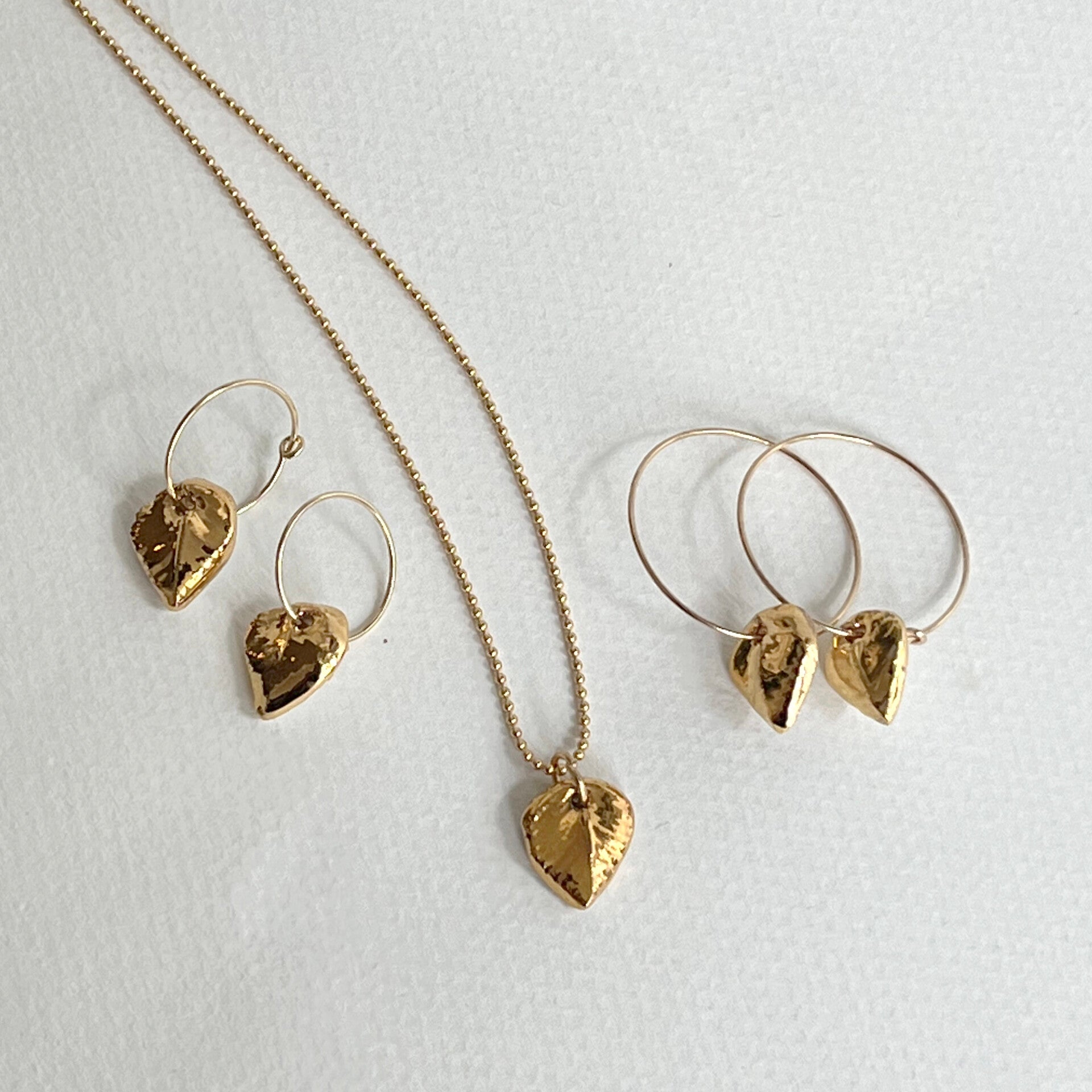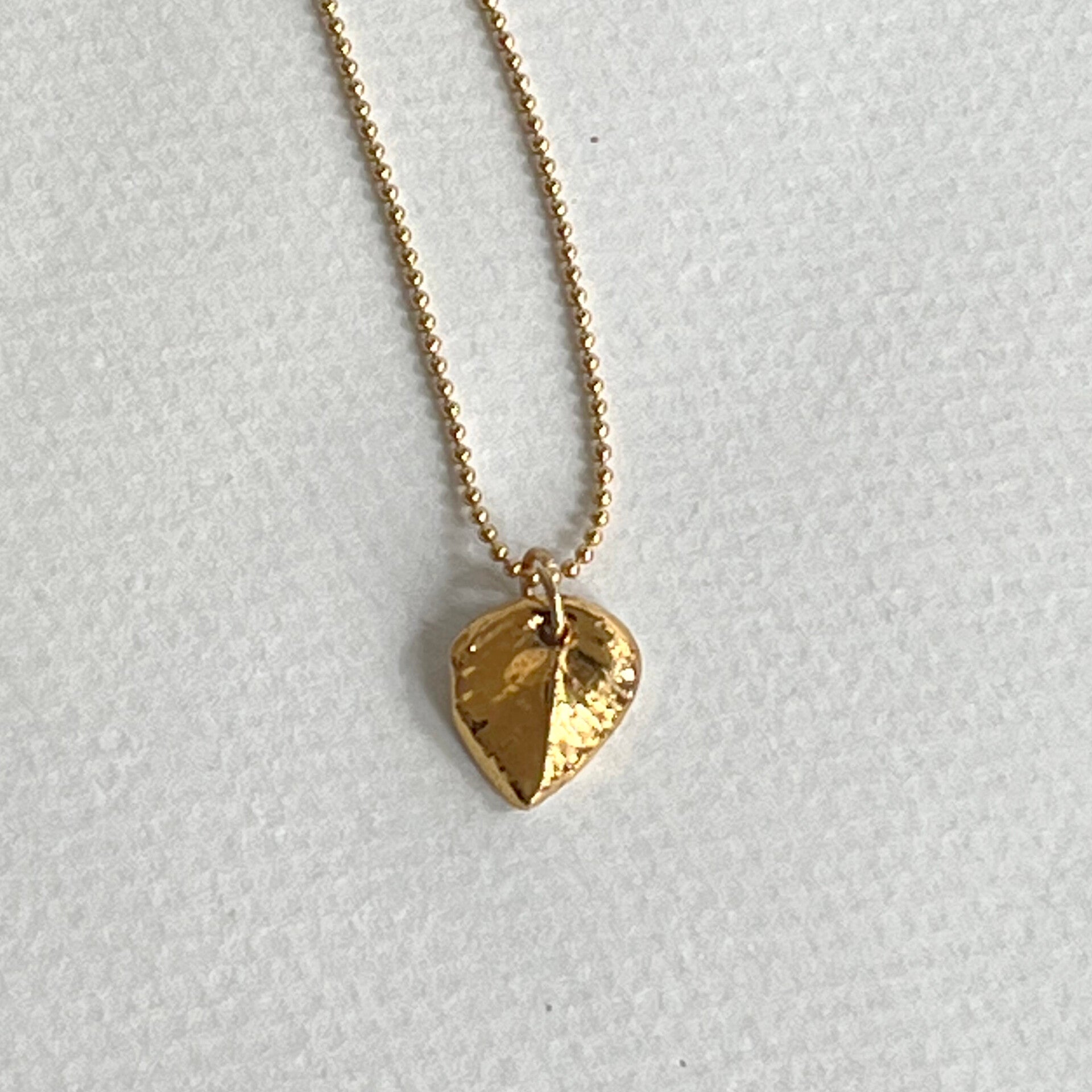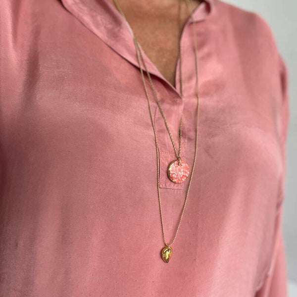 Een verguld blaadje van porselein, hangt aan een ketting van 80cm. De achterzijde van het blaadje is wit, Aan 2 zijden draagbaar.Materiaal ketting: stainless steelMateriaal blaadje: porselein met goudluster (12% 24K goud)